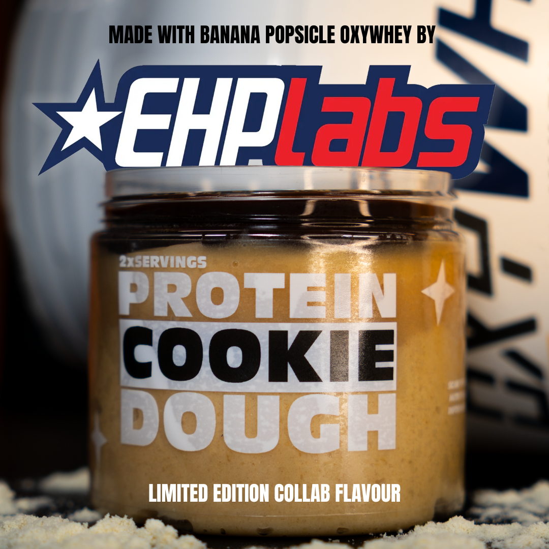 Sweet caramelised banana infused protein cookie dough (made with EHP Labs Banana Popsicle OxyWhey Protein), layered with a rich toffee sauce and topped with a silky white-chocolate crumble for the perfect banoffee bite.