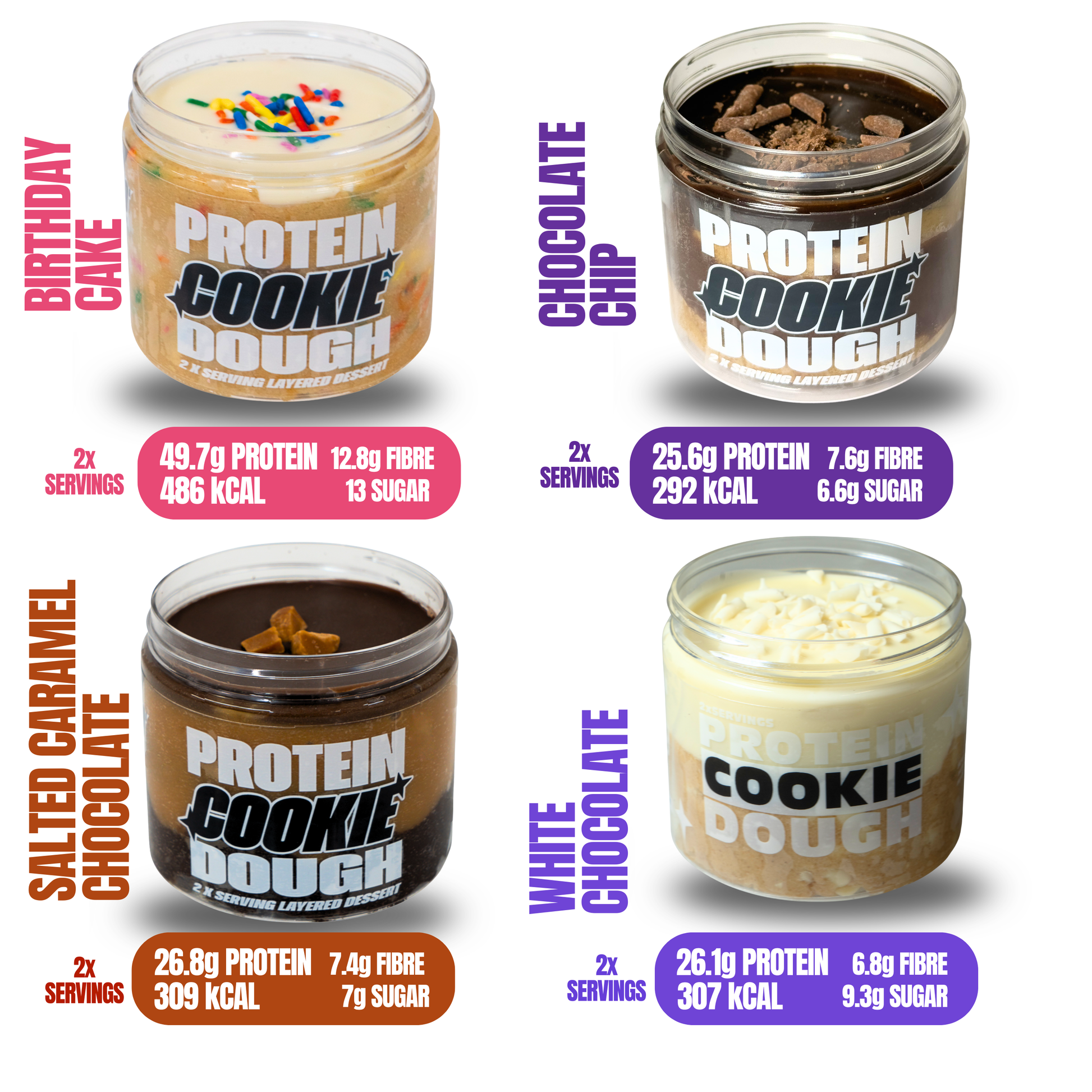 Buttery vanilla protein cookie dough with white chocolate chips layered with a smooth protein sauce. Fibre rich inulin supports gut health while reduced sugar keeps the flavour clean and balanced.