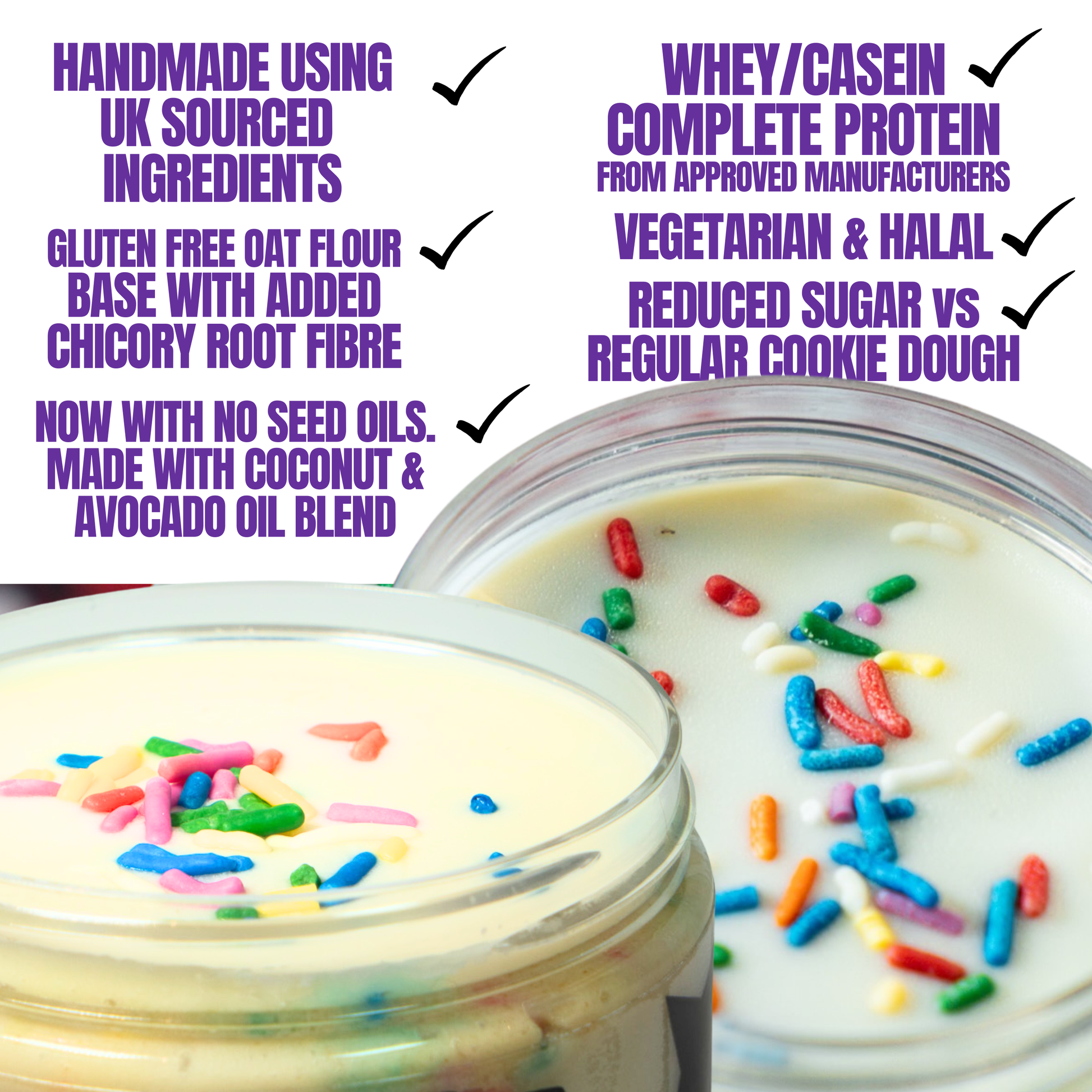 Sprinkle filled cookie dough with cake batter flavour made from gluten free oats and fibre for a satisfying texture. Layered with frosting inspired protein sauce and finished with white chocolate for indulgence without the crash.