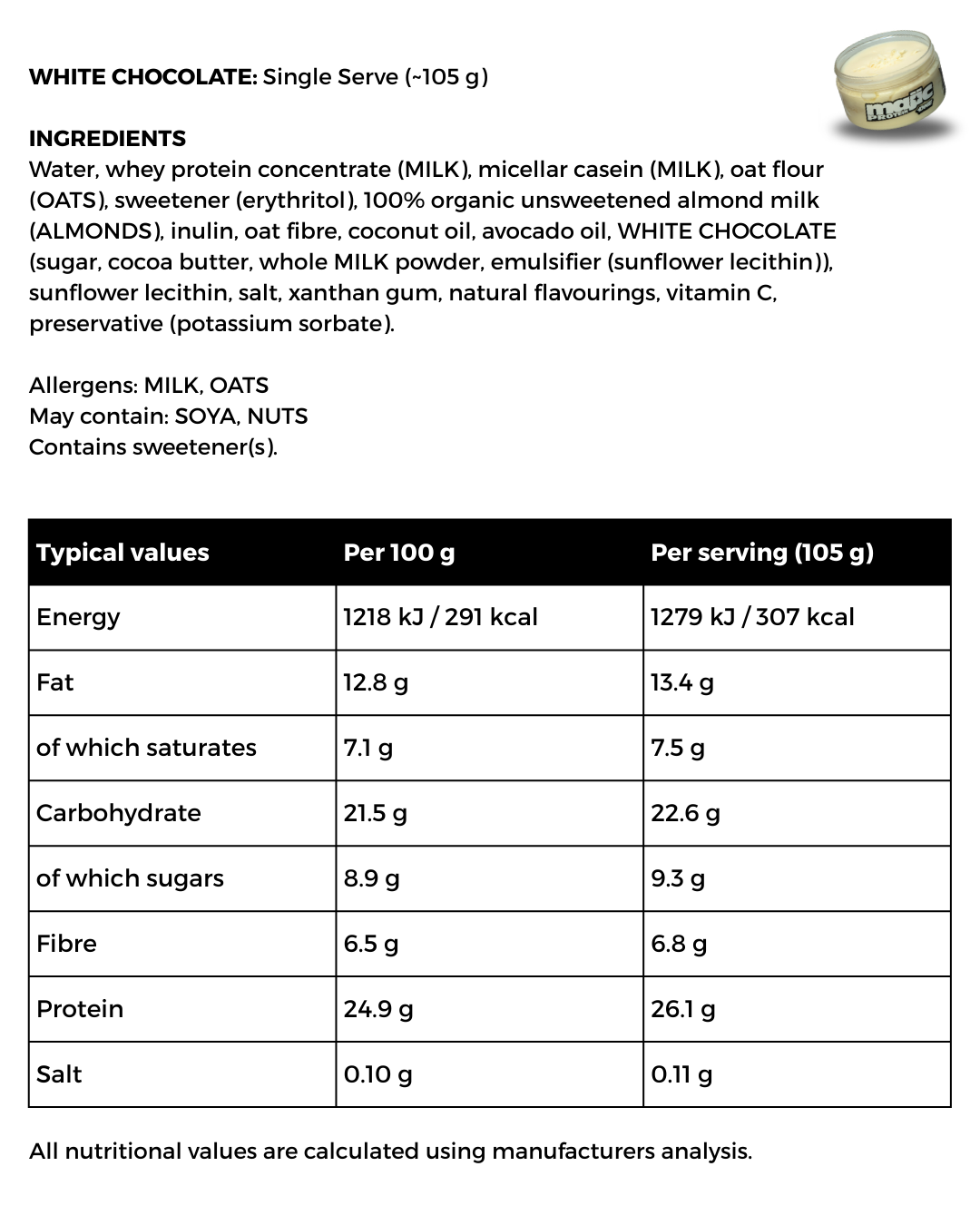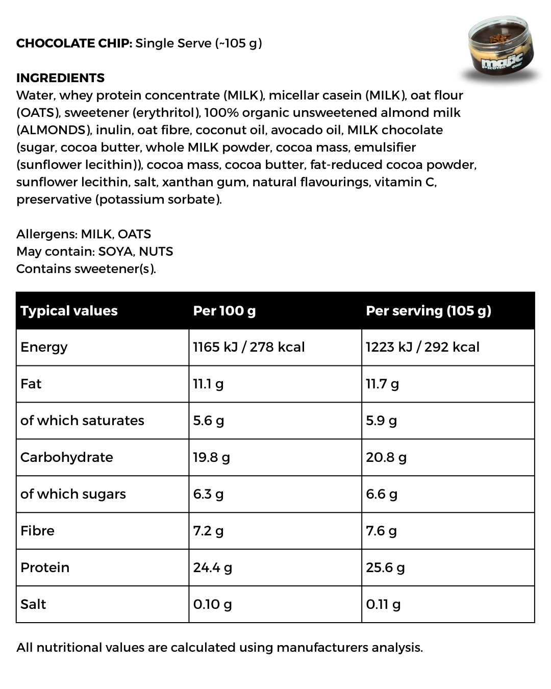 VARIES BETWEEN FLAVOURS: Milk, Almonds. We do not cater to allergies. Some of our flavours are made without Gluten containing ingredients. May contain traces of other nuts. Not suitable for coeliacs. Please see nutritional info page for more info on specific flavours.