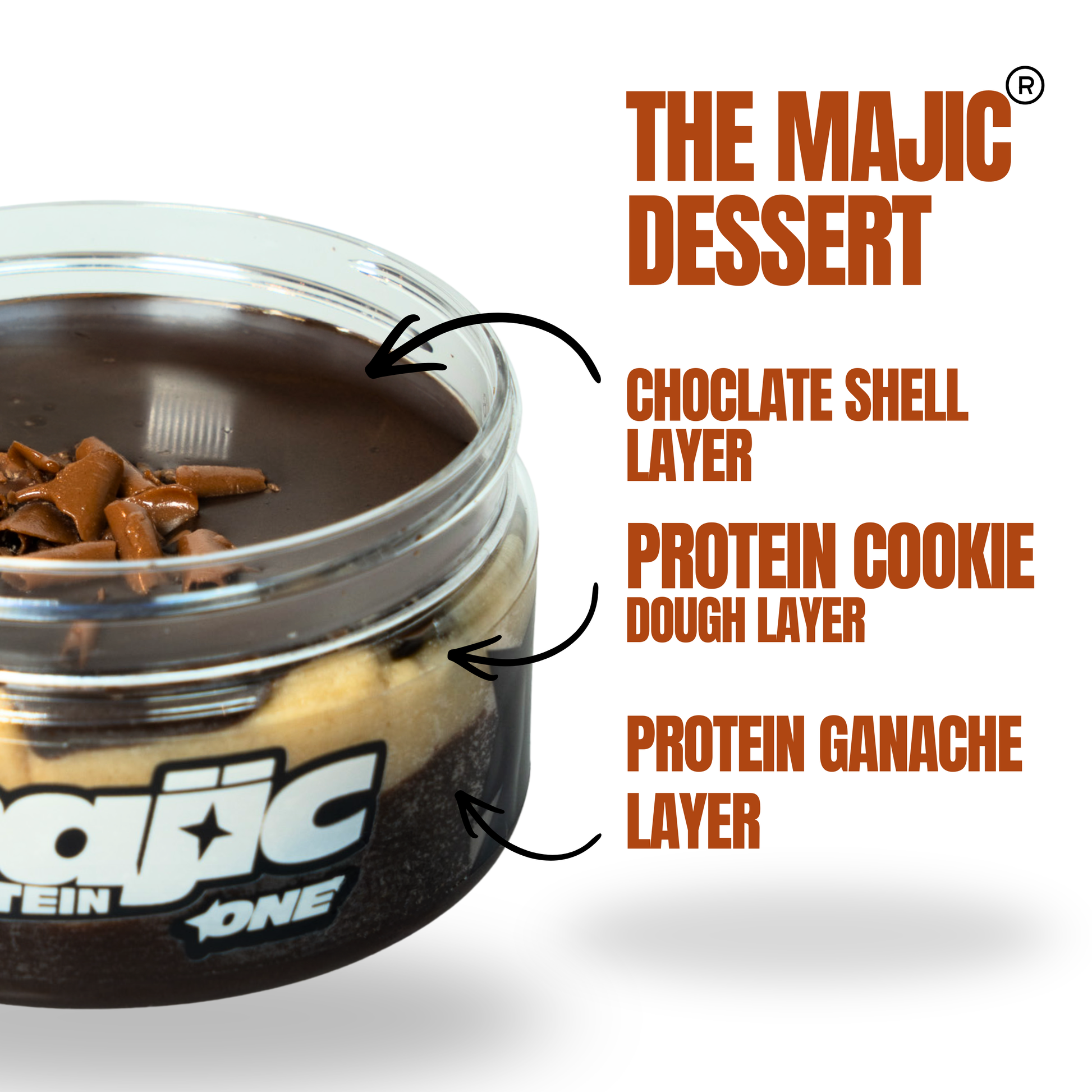 A classic. Vanilla-flavoured high-protein cookie dough studded with chocolate chips, complete with a rich protein-packed sauce. Finished with a crisp chocolate shell. 26g protein. The Majic OG.