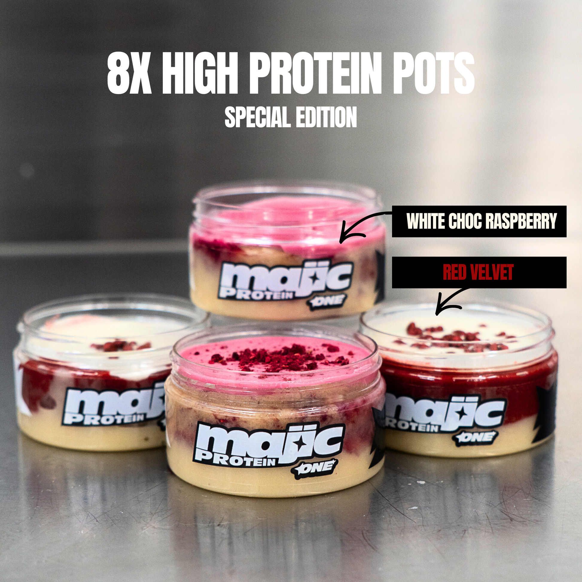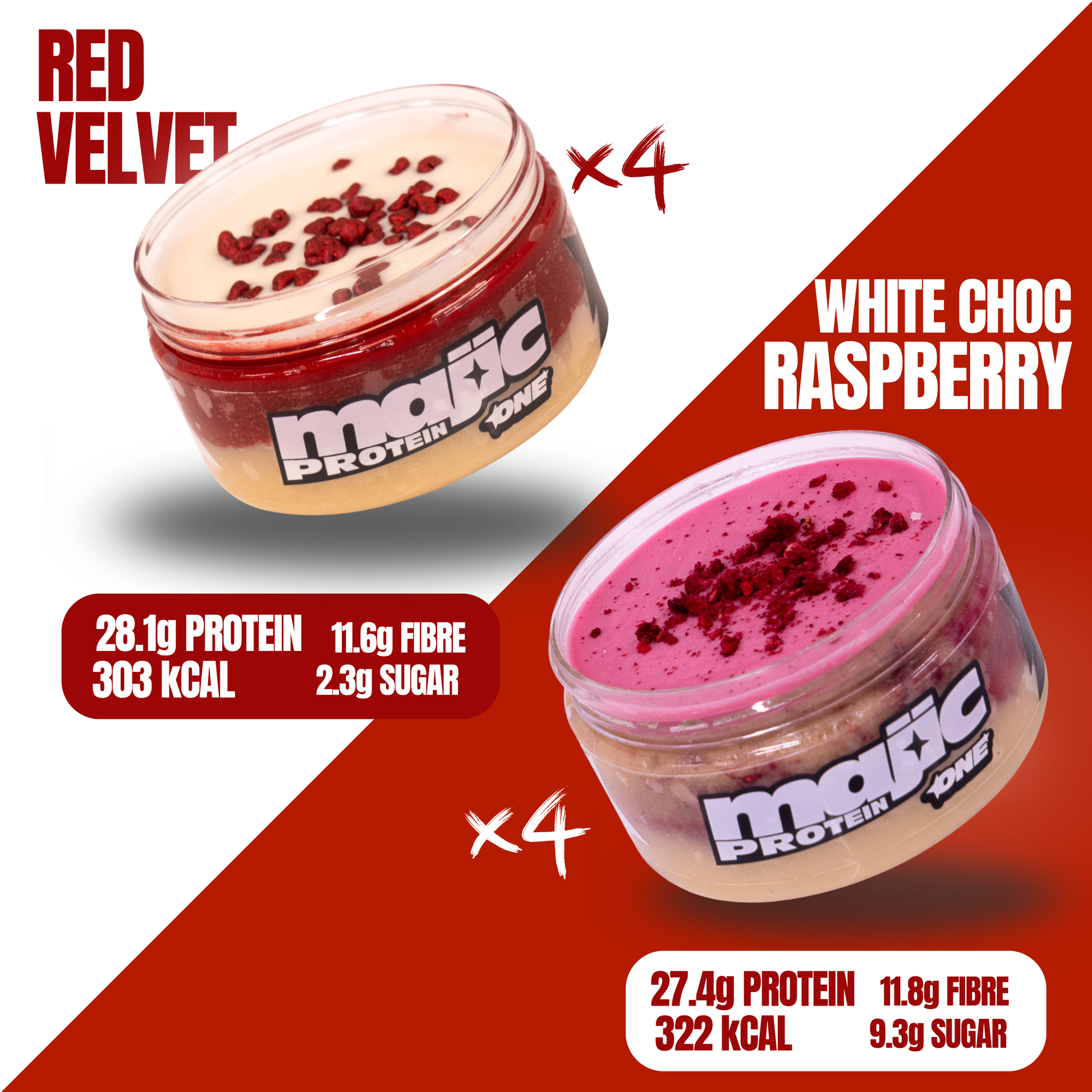 Four indulgent classic size Majic tubs built for sharing with a loved one, or keeping all to yourself. This limited edition Valentine’s box brings together two of our most indulgent flavours yet. Rich, creamy and dessert-first flavour with serious protein to back it up.