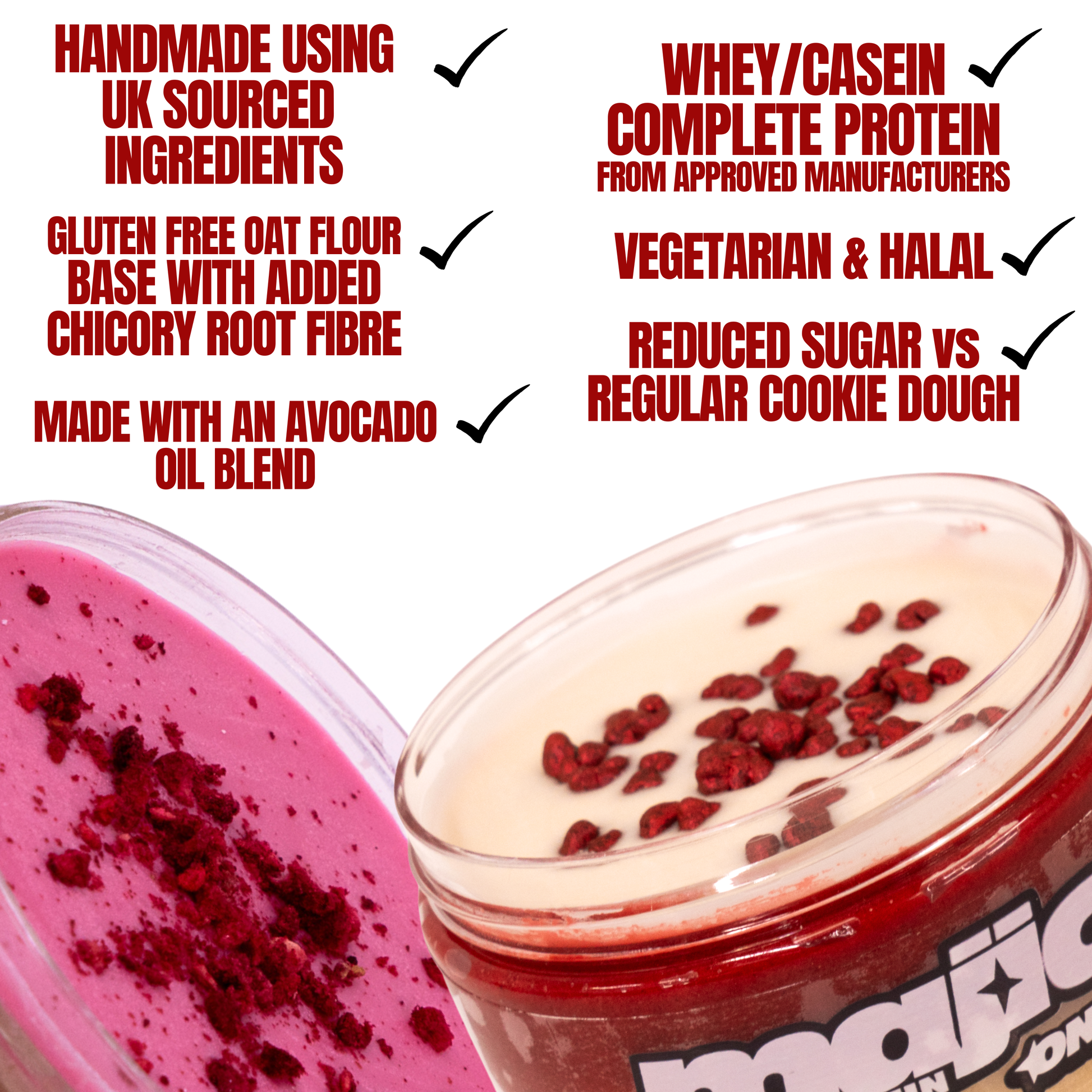 Buttery white chocolate high protein cookie dough built on gluten free oats and fibre rich inulin for digestive support. White chocolate chips add creaminess while real freeze dried raspberry pieces provide a natural fruity tang and vibrant flavour. Layered with a smooth white chocolate protein sauce and finished with a ruby chocolate shell and raspberry pieces.